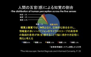 視覚と聴覚を合わせて全体の割合は94%におよび、情報量の多いハイジジョンのマイクロスコープの高倍率の動画を患者さんが体感することによって、口頭のみでの説明の何百倍の情報が脳に届くのです。